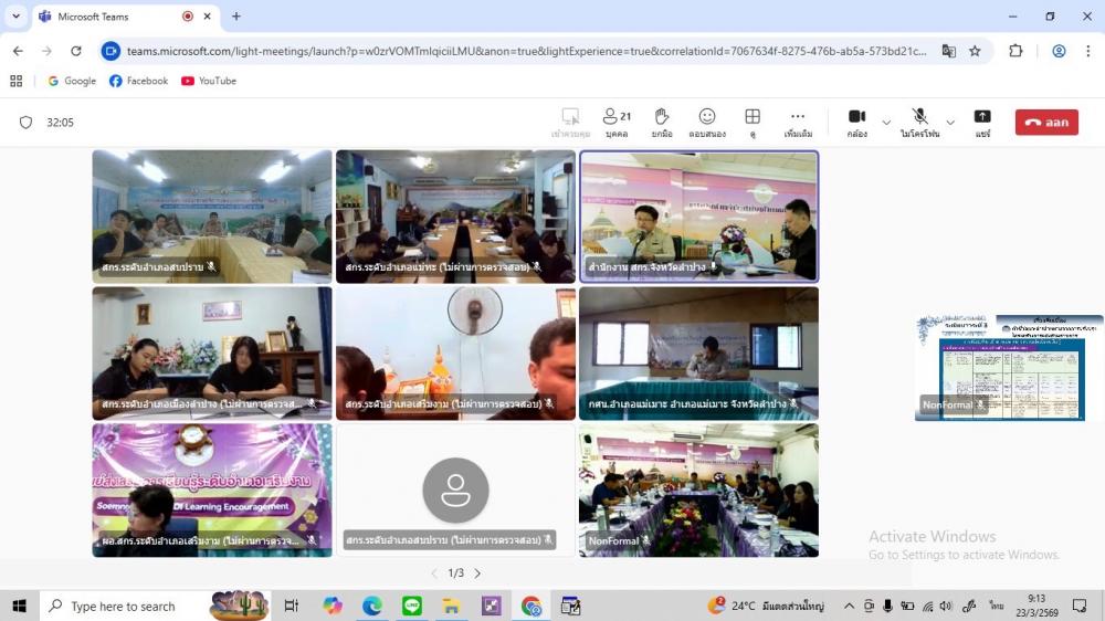วันที่ 23 มีนาคม 2569 เวลา 09.00 น. นายวรพจน์ ไชยพรม ครูรักษาการในตำแหน่ง ผู้อำนวยการ สกร.ระดับอำเภอสบปราบ พร้อมด้วยครูแลบุคลากรทางการศึกษา เข้าร่วมประชุมประจำเดือนผู้บริหาร/หัวหน้ากลุ่ม สำนักงานส่งเสริมการเรียนรู้ประจำจังหวัดลำปาง ครั้งที่ 3/2569 ประจำเดือน มีนาคม 2569 โดยมี นายสมชาย เด็ดขาด ผู้อำนวยการสำนักงานส่งเสริมการเรียนรู้ประจำจังหวัดลำปาง เป็นประธานในการประชุม ผ่านระบบออนไลน์ Microsoft Teams meeting ณ ห้องประชุม สกร.ระดับอำเภอสบปราบ จังหวัดลำปาง