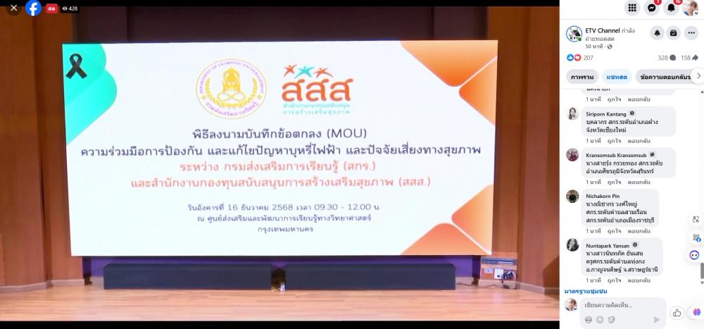 วันที่ 16 ธันวาคม 2568 เวลา 09.30-12.00 น. นายวรพจน์ ไชยพรม ครู รักษาการในตำแหน่ง ผู้อำนวยการ สกร.ระดับอำเภอสบปราบ มอบหมายให้ น.ส.สุกัญญา สุวรรณวงค์ ตำแหน่ง เจ้าพนักงานธุรการ และ นายธีรพงศ์ หาญณรงค์ ตำแหน่ง ครูผู้สอนคนพิการ เข้าร่วมรับชมการถ่ายทอดสดพิธีลงนามบันทึกข้อตกลงความร่วมมือการป้องกันและแก้ไขปัญหาบุหรี่ไฟฟ้าและปัจจัยเสี่ยงทางสุขภาพ ผ่านช่องทาง Facebook Live ETV Channel และการชี้แจงกิจกรรมพัฒนาศักยภาพด้านการควบคุมยาสูบ (บุหรี่และบุหรี่ไฟฟ้า) เพื่อสร้างสิ่งแวดล้อมการเรียนรู้และสังคมปลอดบุหรี่ บุหรี่ไฟฟ้า และปัจจัยเสี่ยงทางสุขภาพ ผ่านกลไกการเรียนรู้และการมีส่วนร่วมของเครือข่ายการศึกษาทั้งในระดับพื้นที่และส่วนกลาง ผ่านระบบ Zoom Meeting ณ ศูนย์ส่งเสริมการเรียนรู้ระดับอำเภอสบปราบ จังหวัดลำปาง