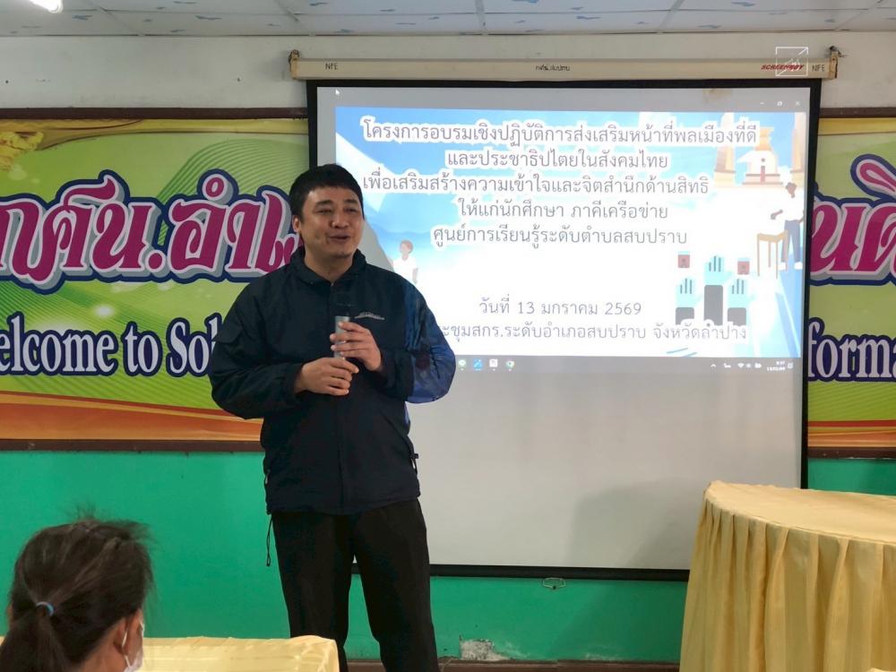 วันที่ 13 มกราคม 2569 นายวรพจน์ ไชยพรม ครู รักษาการในตำแหน่งผู้อำนวยการศูนย์ส่งเสริมการเรียนรู้ระดับอำเภอสบปราบ มอบหมายให้ ครู ศกร ตำบลสบปราบ จัดโครงการส่งเสริมหน้าที่พลเมืองที่ดีและประชาธิปไตยในสังคม เพื่อสร้างความรู้ความเข้าใจที่ถูกต้องเกี่ยวกับสิทธิ เสรีภาพ และหน้าที่ของพลเมืองตามระบอบประชาธิปไตยอันมีพระมหากษัตริย์ทรงเป็นประมุข ณ ห้องประชุม สกร.ระดับอำเภอสบปราบ